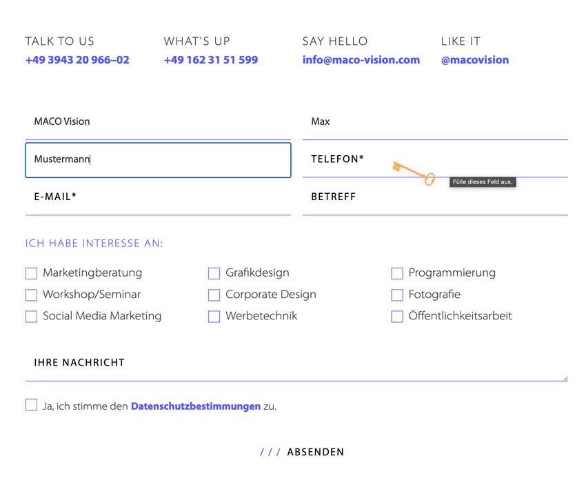 Kennzeichnen Sie Pflichtfelder zum Beispiel mit einem Stern-Symbol.