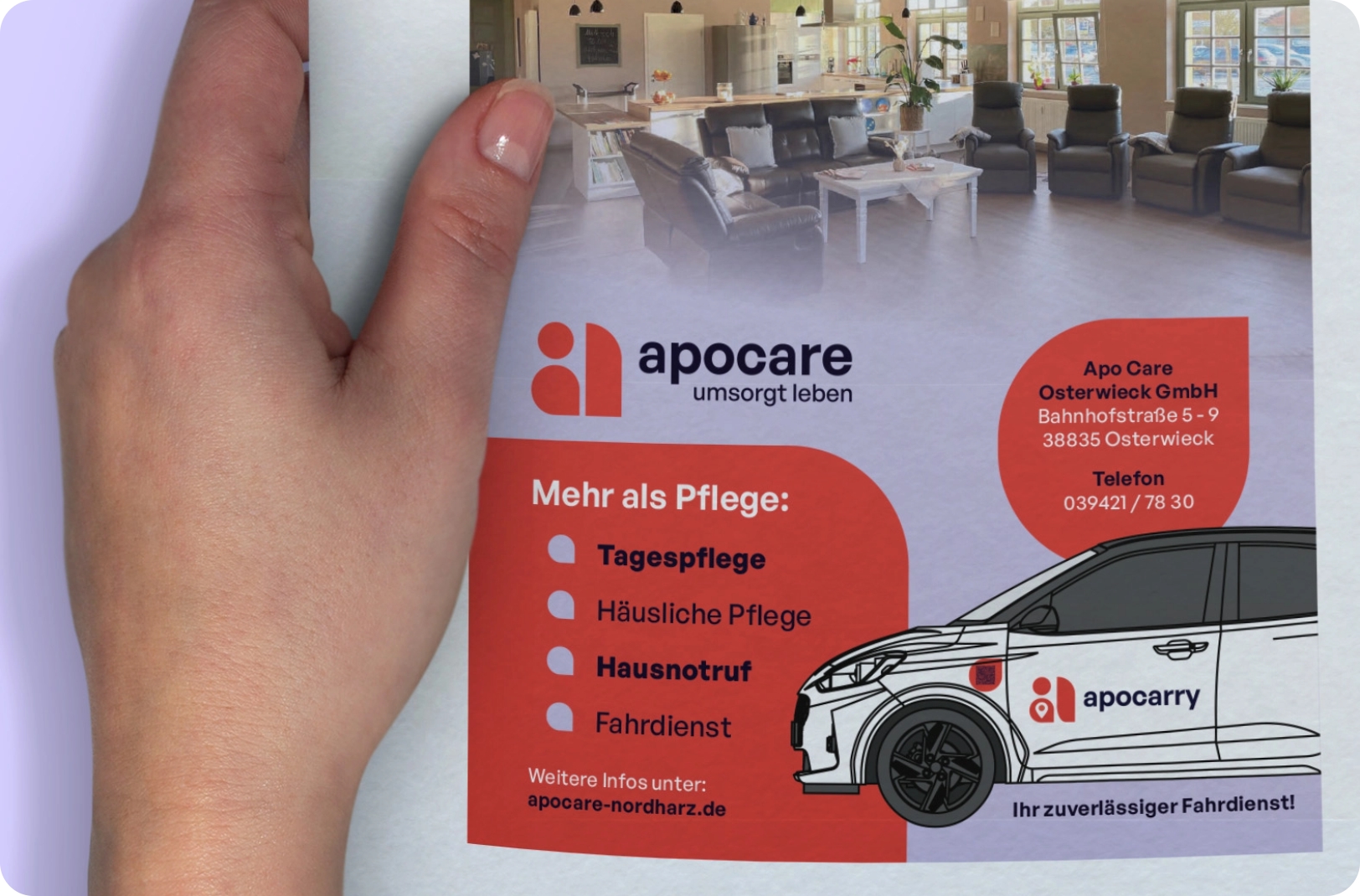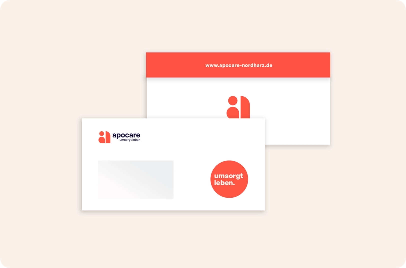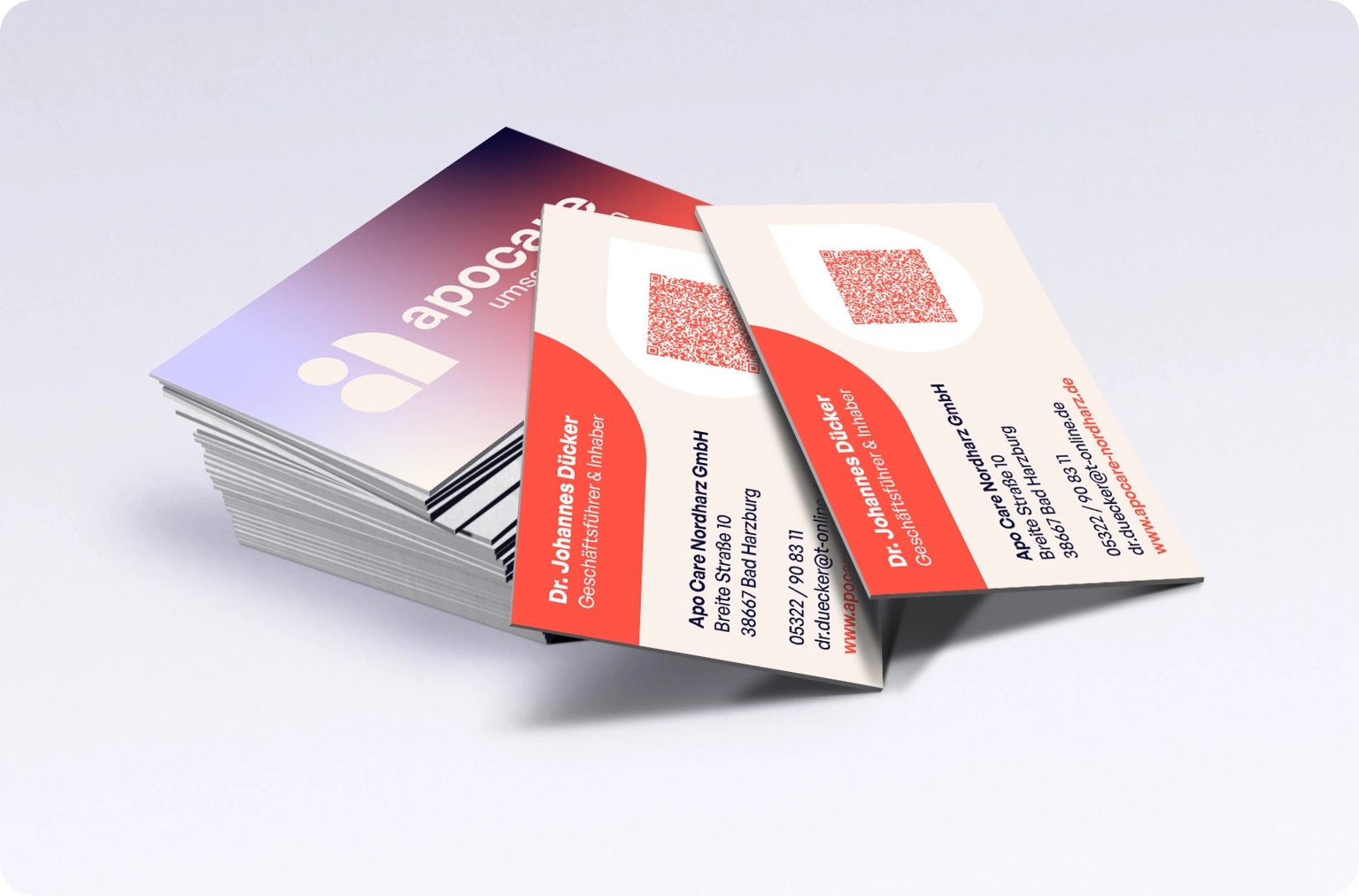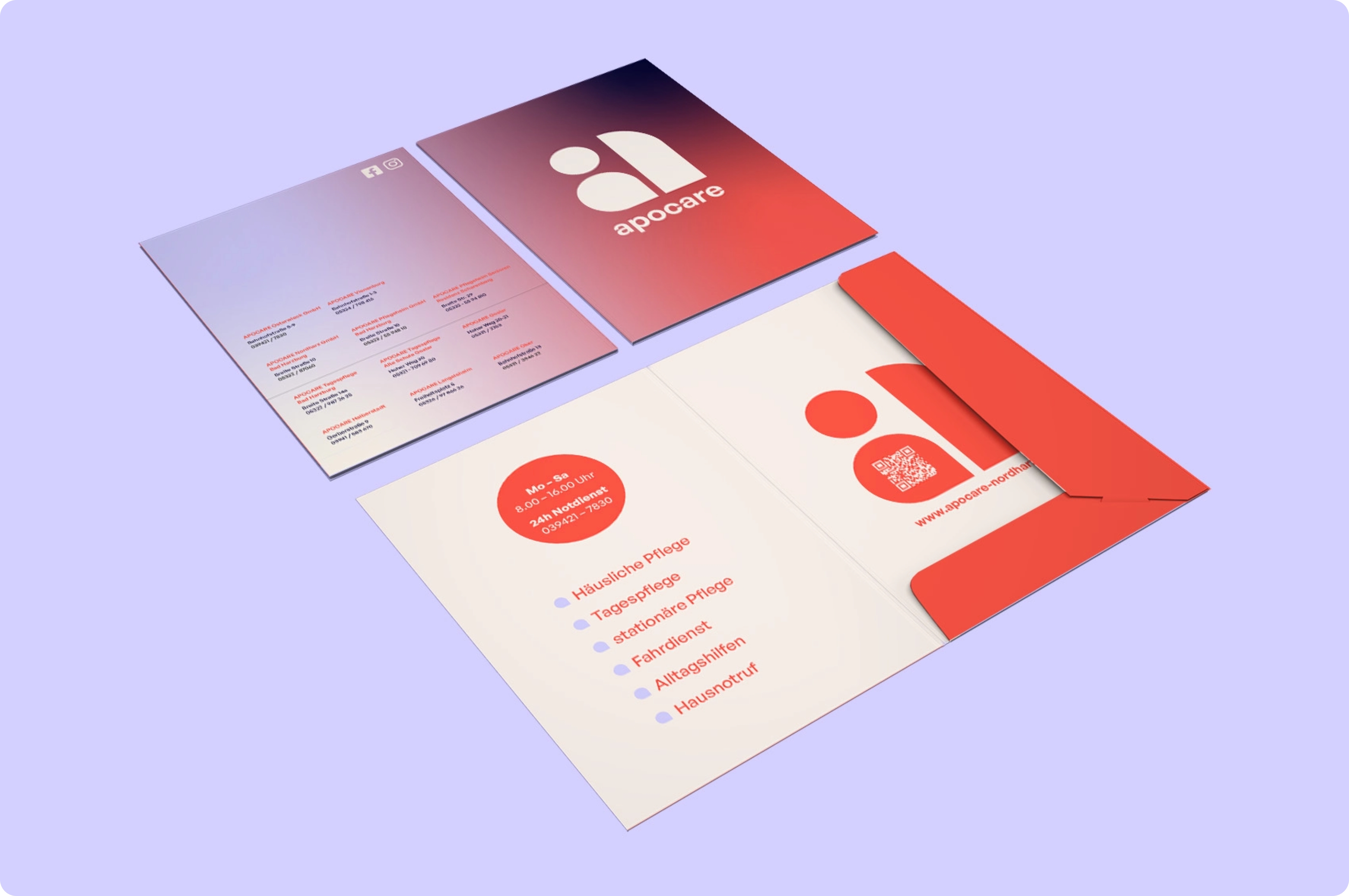 Der rote Faden des neuen Designs zieht sich nicht nur digital, sondern auch durch die greifbare Welt von Apocare. Von Printprodukten bis hin zur Geschäftsausstattung – jedes Produkt wurde mit Liebe zum Detail gestaltet, um einen einheitlichen und ansprechenden Eindruck zu hinterlassen. Die Visitenkarten sind nicht nur Informationsgeber, sondern laden zum Vernetzen ein. Die Briefbögen inklusive passender Briefumschläge setzen die professionelle Note fort. Eine ansprechende Präsentationsmappe rundet das Gesamtbild ab, um einen bleibenden Eindruck zu hinterlassen. Auch vor Ort durften wir das neue Design in die Realität umsetzen.
