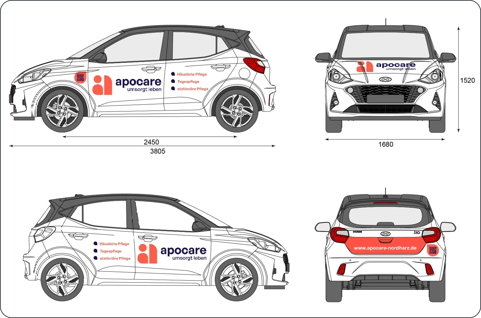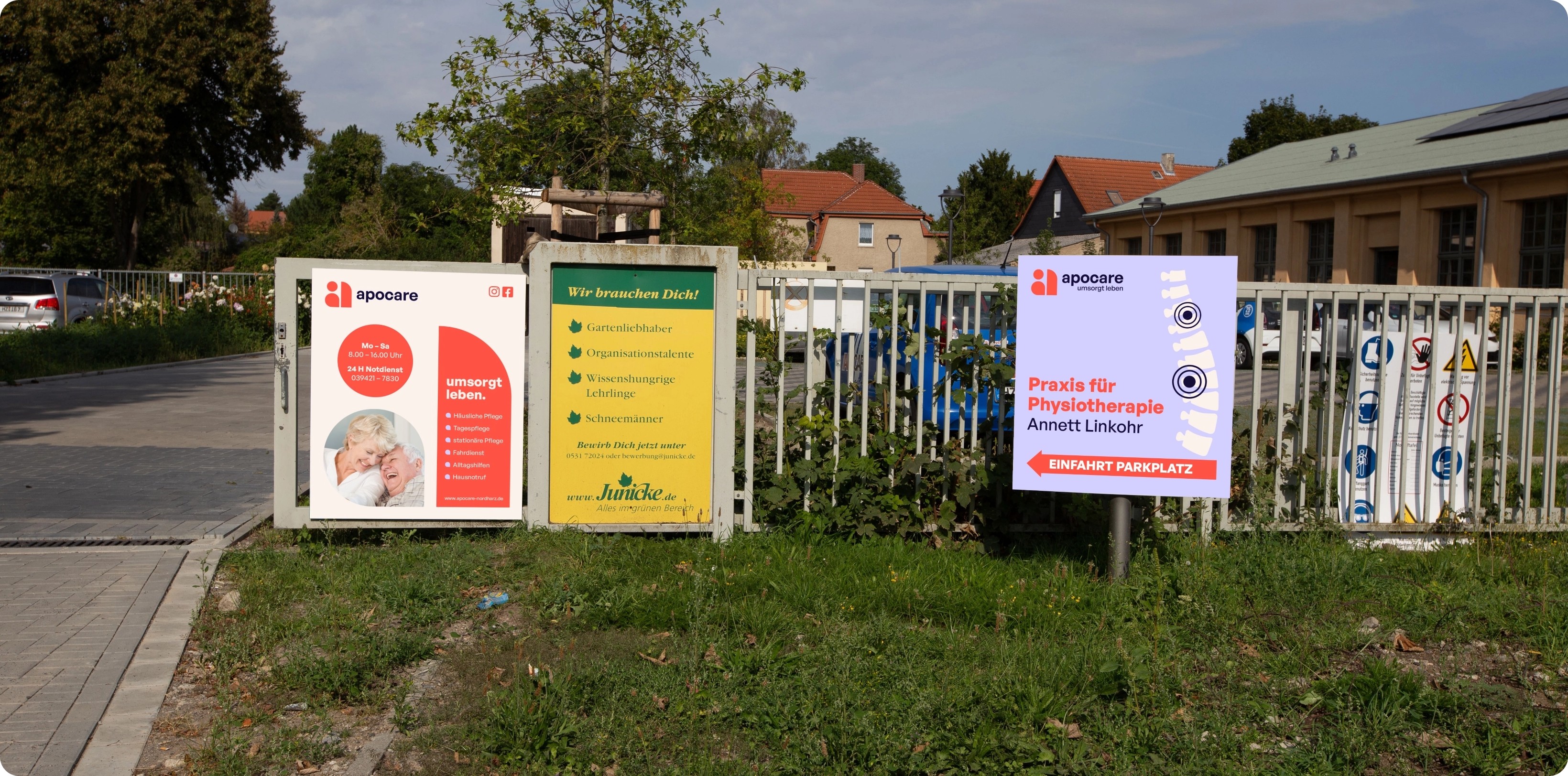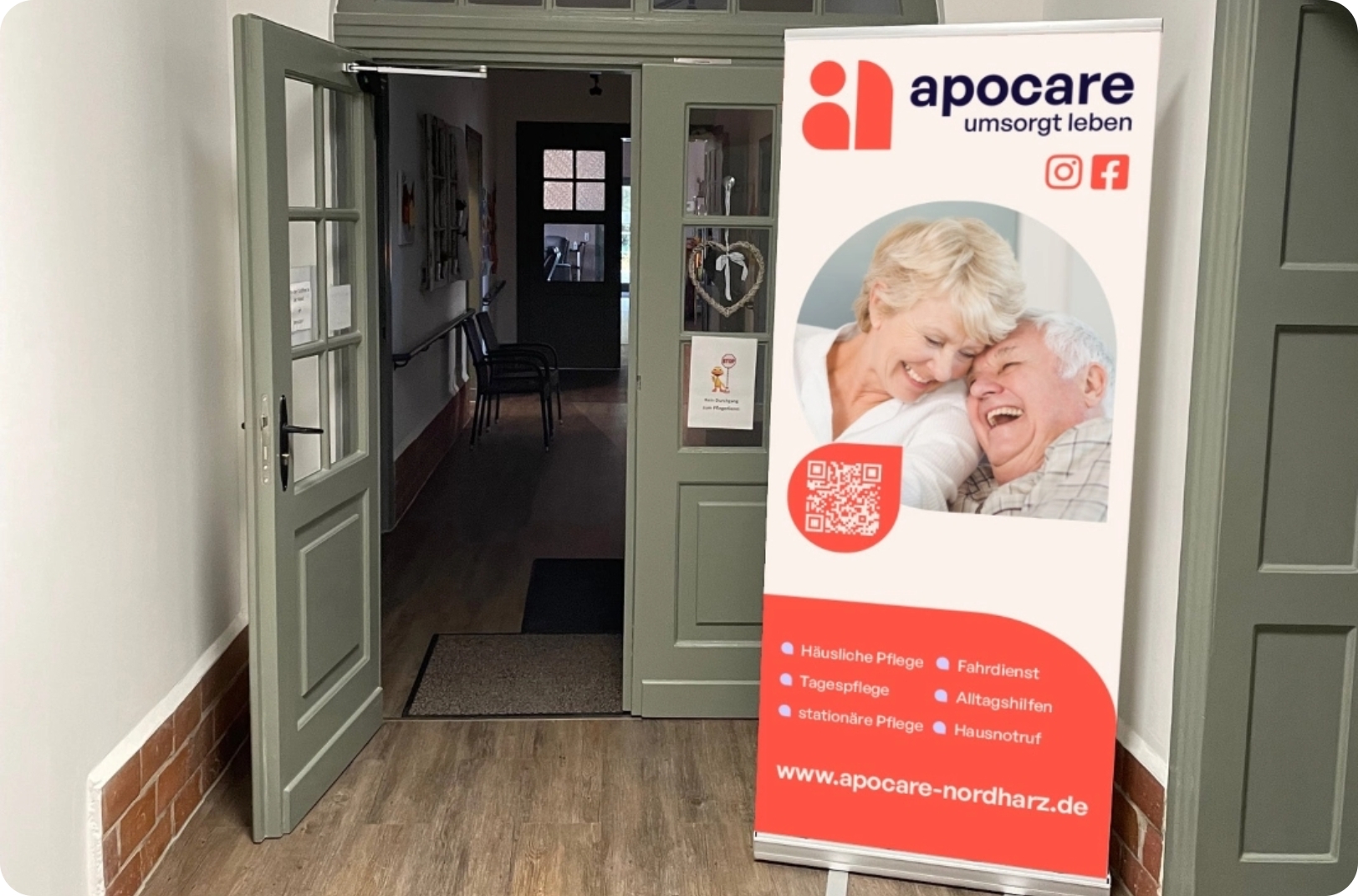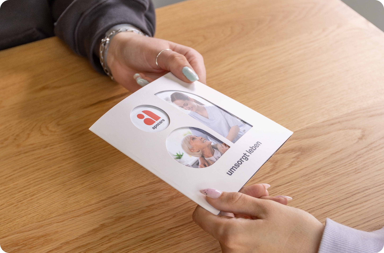 Der rote Faden des neuen Designs zieht sich nicht nur digital, sondern auch durch die greifbare Welt von Apocare. Von Printprodukten bis hin zur Geschäftsausstattung – jedes Produkt wurde mit Liebe zum Detail gestaltet, um einen einheitlichen und ansprechenden Eindruck zu hinterlassen. Die Visitenkarten sind nicht nur Informationsgeber, sondern laden zum Vernetzen ein. Die Briefbögen inklusive passender Briefumschläge setzen die professionelle Note fort. Eine ansprechende Präsentationsmappe rundet das Gesamtbild ab, um einen bleibenden Eindruck zu hinterlassen. Auch vor Ort durften wir das neue Design in die Realität umsetzen.
