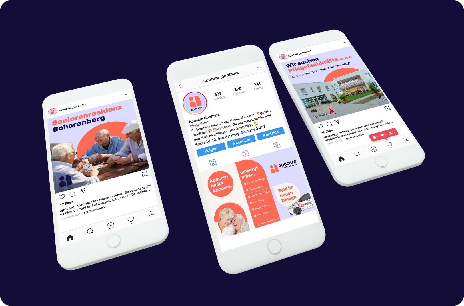 Auf den sozialen Medien hat Apocare einen neuen Anstrich bekommen! Das neue Design spiegelt sich auch in den Postings wider und verleiht der digitalen Präsenz von Apocare einen einheitlichen und ansprechenden Look. Von inspirierenden Vorstellungen der Einrichtungen bis hin zu informativen Postings erstrahlt jeder Beitrag nun im neuen Glanz. Denn unsere Posts sind nicht nur Informationsträger, sondern auch emotionale Verbindungspunkte für die Zielgruppe.