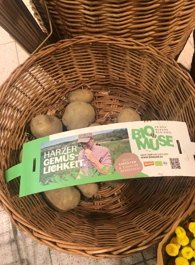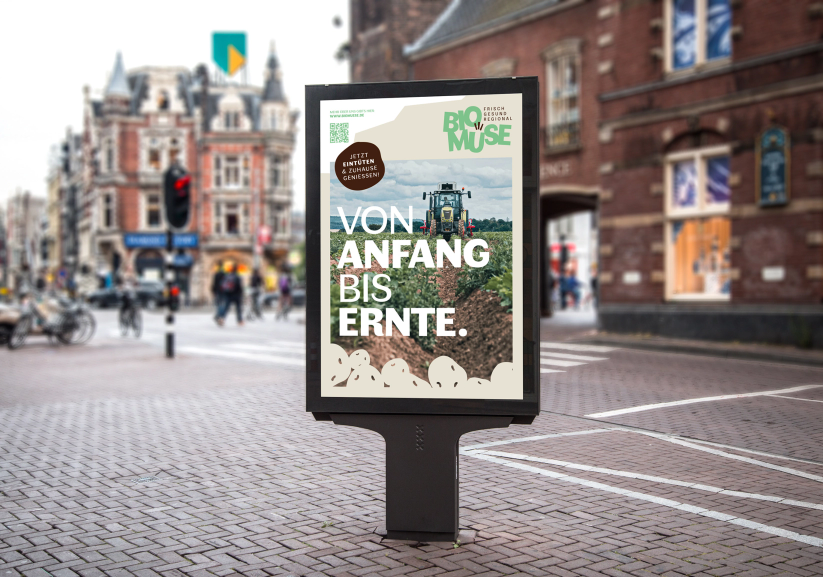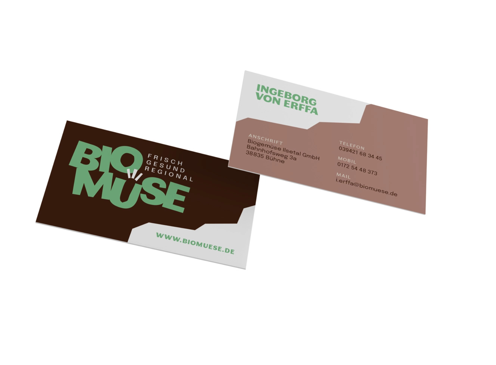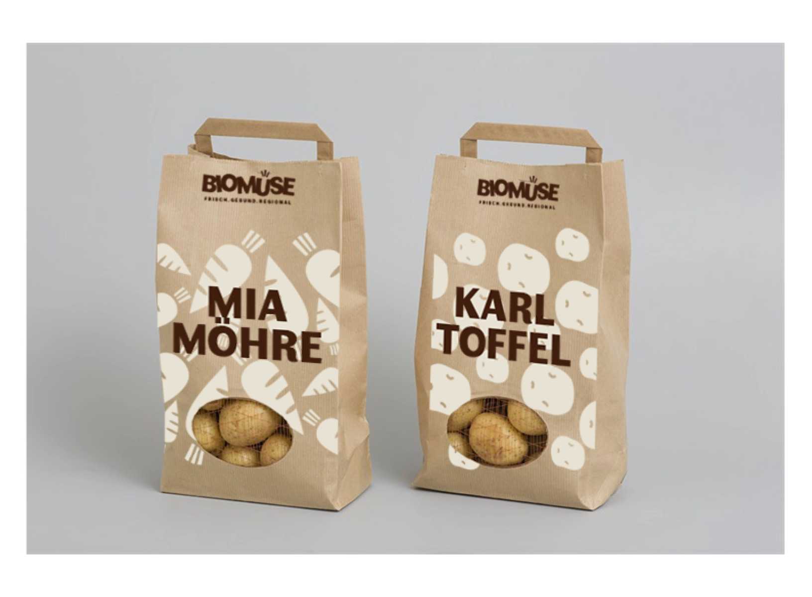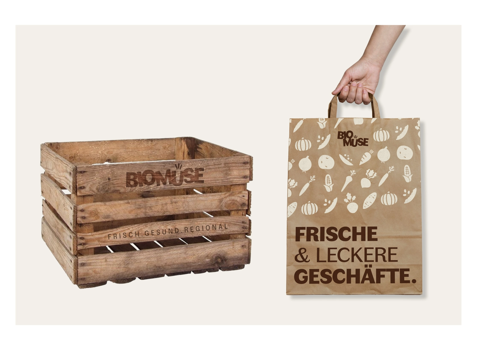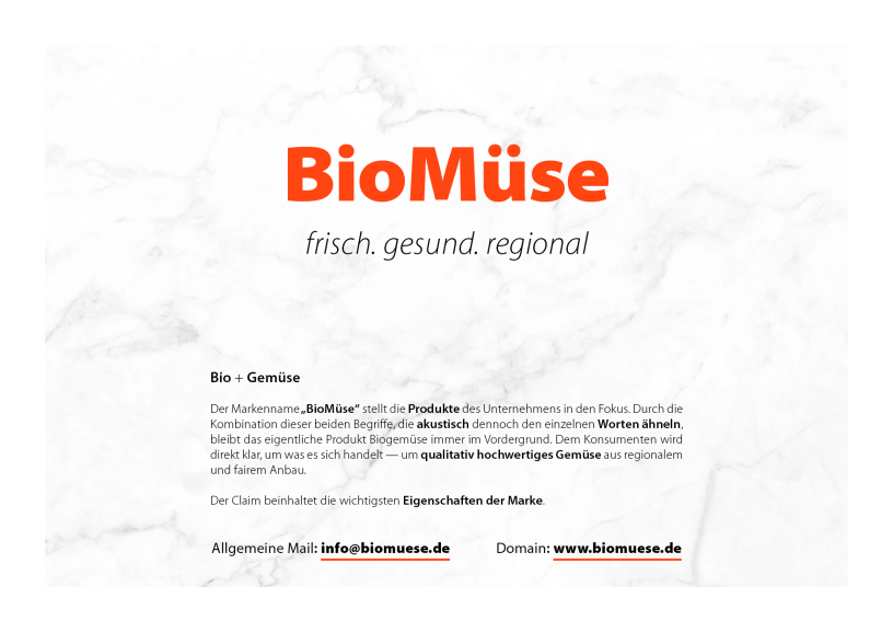 Der Markenname „BioMüse“ stellt die Produkte und den Anspruch des Unternehmens in den Fokus. Durch die Kombination dieser beiden Begriffe, die akustisch dennoch den einzelnen Worten ähneln, bleibt das eigentliche Produkt Bio-Gemüse immer im Vordergrund. Dem Konsumenten wird direkt klar, um was es sich handelt — um qualitativ hochwertiges Gemüse aus regionalem und fairem Anbau. Der Claim „frisch.gesund.regional“ beinhaltet die wichtigsten Eigenschaften der Marke.