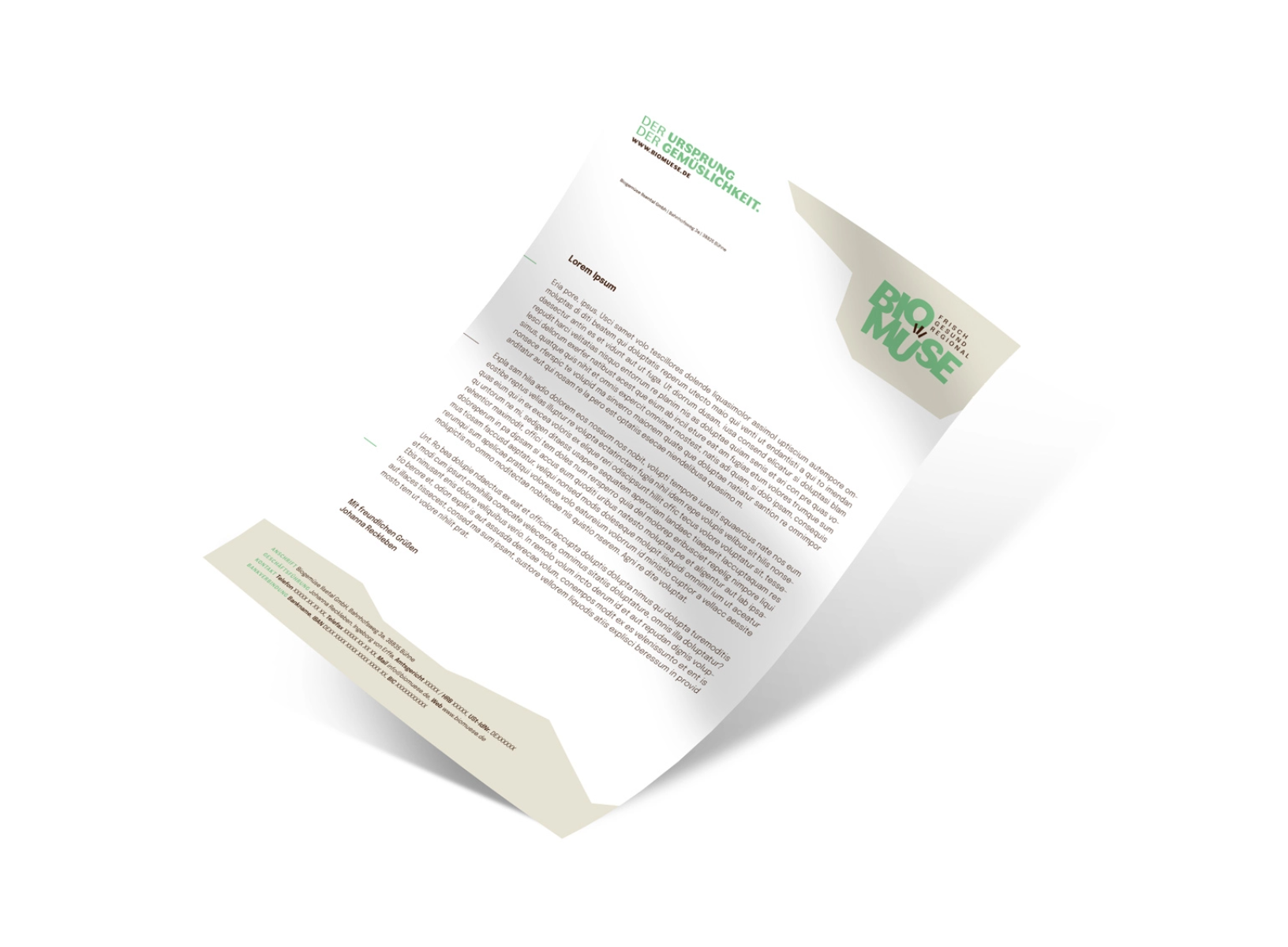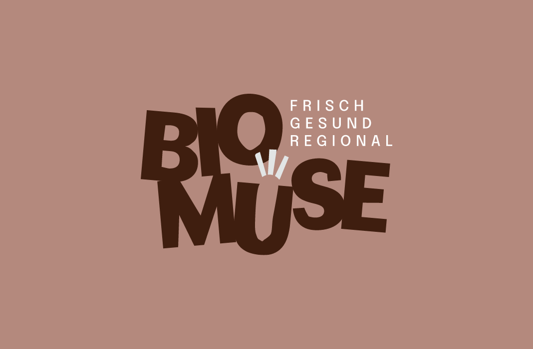 Um das innovative Streben und den Anspruch auf Natürlichkeit widerzuspiegeln, wurde der Markenname „BioMüse“ in einer modernen serifenlosen Schrift gesetzt und nachträglich krumm und schief angepasst. Die Marke erhält dadurch einen natürlichen Charakter, der dem Bio-Gemüse gleicht. In dem Buchstaben „Ü“ wurde eine Karotte optisch versteckt. Als Primärfarben wurde ein gedeckter Grünton in Verbindung mit einem natürlichen Braunton verwendet. Als Gestaltungselemente werden die angebotenen Gemüsesorten verwendet.