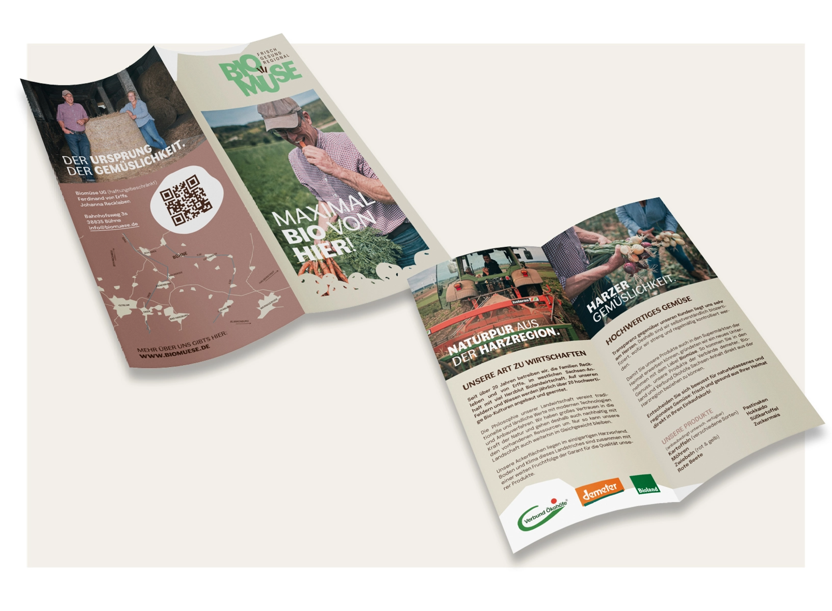 Für dieses besondere Projekt aus der eigenen Region haben wir einen modernen Markennamen kreiert und ein auffälliges, kreatives Design entworfen, das jedes andere Gemüse in den Schatten stellt. Die Printprodukte wirken modern und erfrischend. Ein cooles Design für top Bioprodukte aus dem Harz.