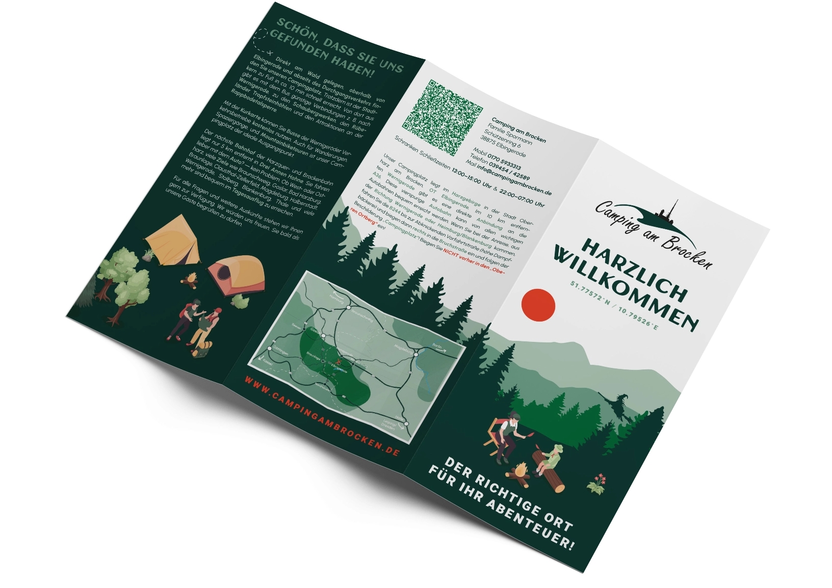 Anhand des bestehenden Corporate Designs wurden Ideen und Konzepte für die Werbemittel von Camping am Brocken entwickelt. Für die Flyer des Unternehmens wurden für Wald und Natur charakteristische Grüntöne gewählt, die die Naturbelassenheit des Harzes und die Nähe zum Brocken symbolisieren. Mit der Farbe der aufgehenden Sonne werden auch im Fließtext Akzente gesetzt, der Rotton eignet sich optimal für Highlights. Schon mit dem Flyer tauchen Sie in den Campingplatz ein: Fotos der Anlage und Impressionen des Geländes vermittelt sogleich einen ersten Eindruck des Unternehmens.