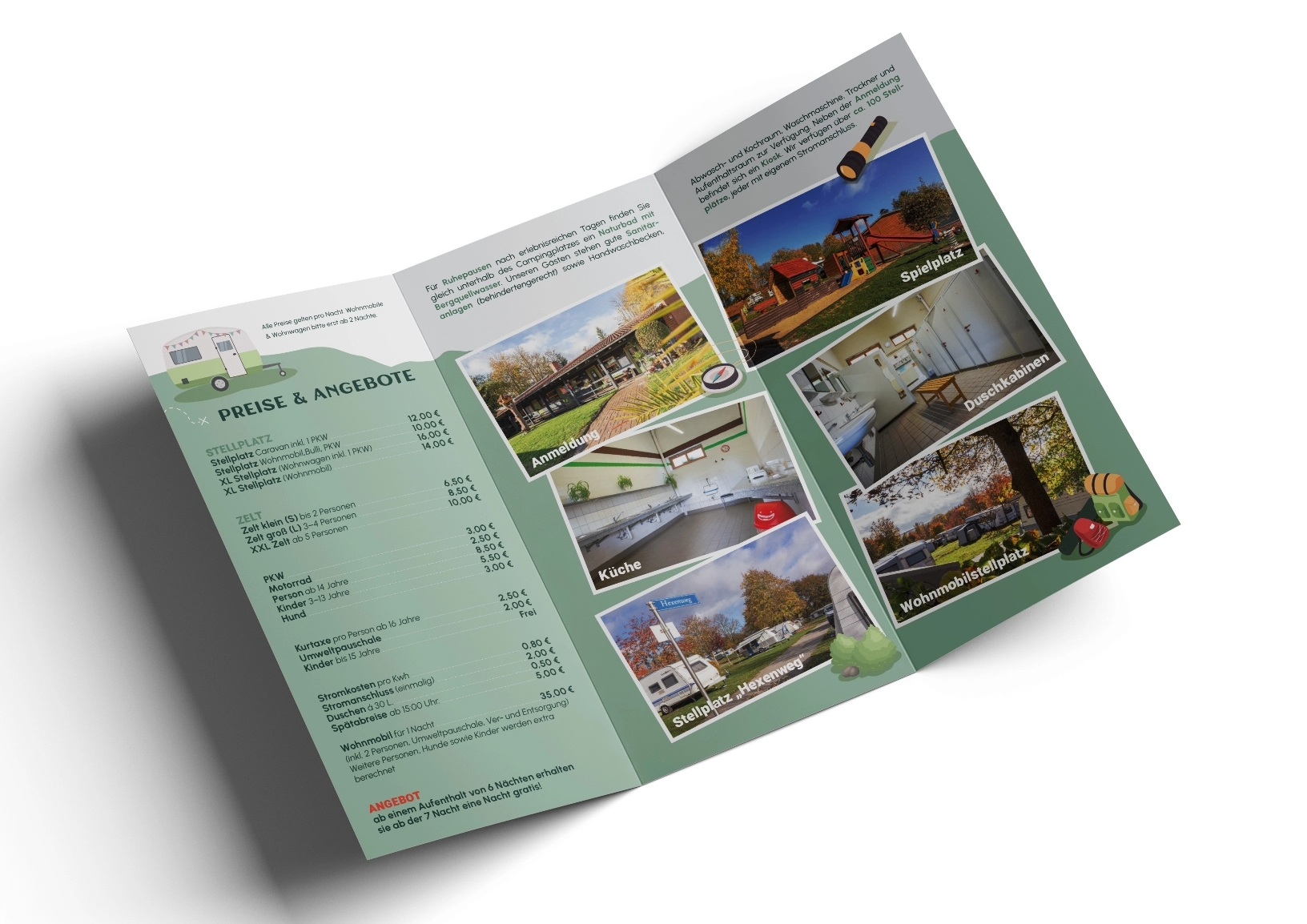 Mit professionellen Fotos wirken die Website und Werbemittel gleich viel anschaulicher und das Unternehmen wirkt nahbar. Die Fotos des Campingplatzes und der Anlage sorgen für eine freundliche Dynamik auf dem Flyer und lassen auch die Website lebendiger wirken. Potenzielle Kunden, die Ihre Website besuchen oder Ihren Flyer in den Händen halten, sollen einen positiven Eindruck bekommen und werden sich mit einer professionellen und optimalen Präsentation Ihrer Marke an Sie erinnern.