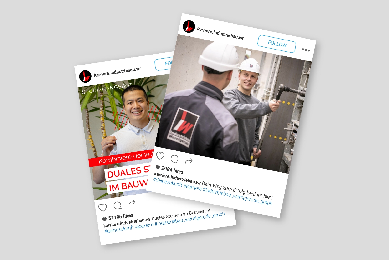 Mit Fotos und Videos zeigen wir hier alle wichtigen Infos zu den Karrieremöglichkeiten in übersichtliche Postings verpackt und befragen die Mitarbeiter und Mitarbeiterinnen, die bereits das geschafft haben, was unsere Zielgruppe noch anstrebt: Sie haben Karriere in der Industriebau Wernigerode GmbH gemacht. Neben Einblicken in den Azubi-Alltag und Impressionen der aktuellen Messen werden hier Erfolgsgeschichten erzählt – in den Postings und mit dem Karriere-Account.