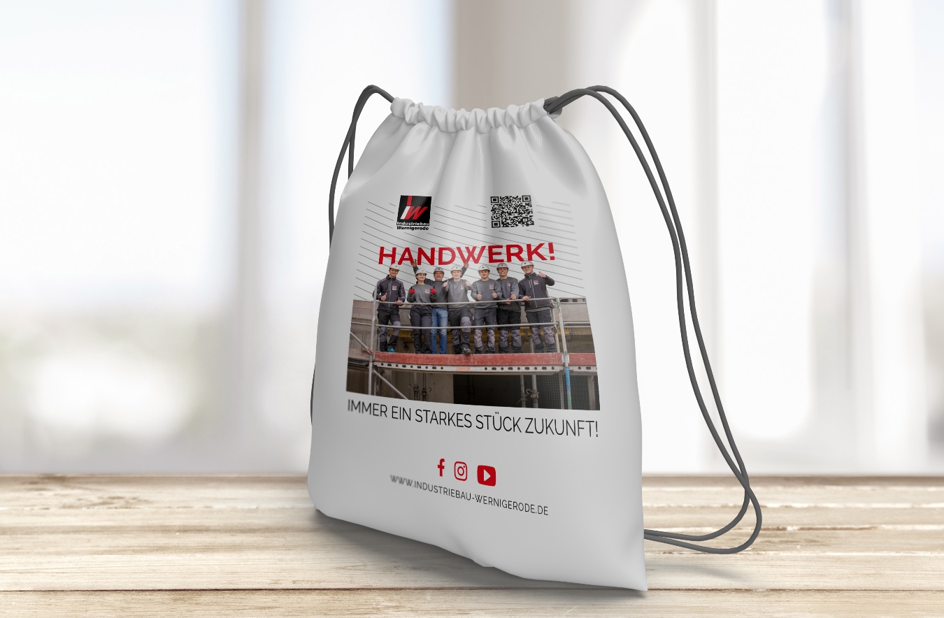 Ob ihr neue Mitarbeiter willkommen heißt oder euch auf einer Berufs- oder Studienmesse präsentieren, unsere frischen Turnbeutel sind ein perfektes Accessoire, um einen positiven Eindruck zu hinterlassen. Im Onboarding-Paket oder auf Messen als Goodie, eine kleine Aufmerksamkeit ist immer gern gesehen – noch lieber, wenn das Design überzeugt und es gern genutzt wird. Der Turnbeutel vertritt gleichzeitig noch einen Grundsatz: Handwerk ist immer ein starkes Stück Zukunft. Da kann die Karriere bei der Industriebau Wernigerode GmbH starten!