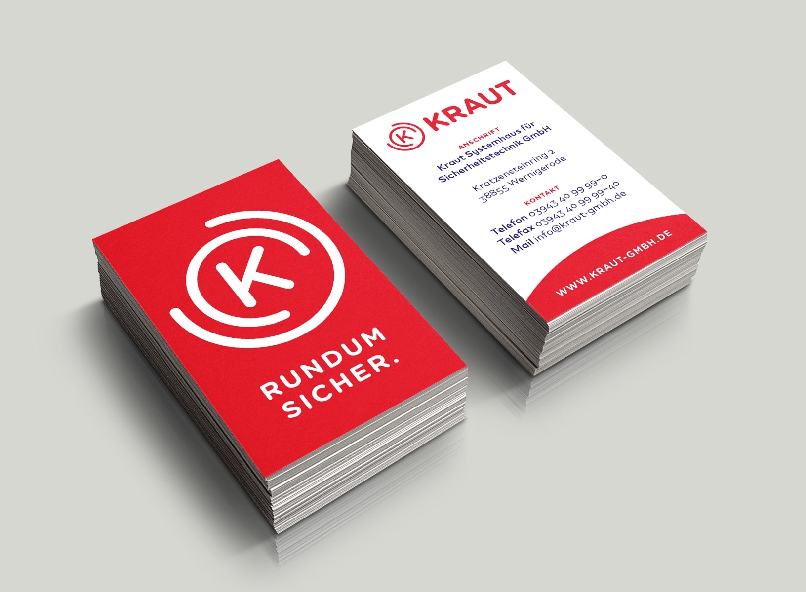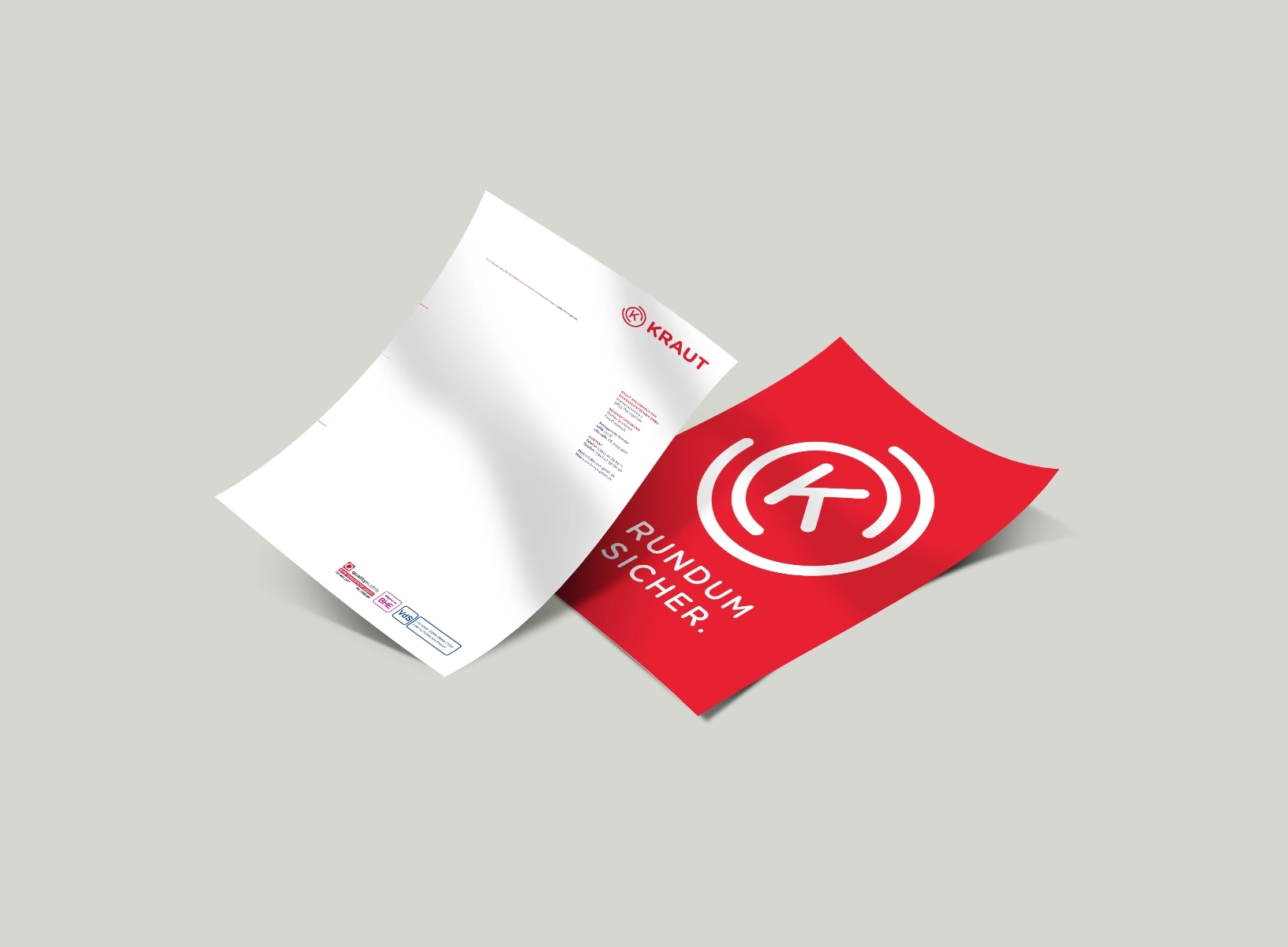 Dem Wunsch der Familie Dreisbach, das Corporate Design der Firma in die Zukunft zu holen, sind wir gerne nachgekommen. Dabei wurde aus einer klassischen Wortmarke eine Wort-Bild-Marke. Hierbei haben wir die Farbigkeit ebenfalls angepasst und für das bestehende Rot einen etwas freundlicheren Ton gewählt und das harte Schwarz durch ein Blau substituiert. Die Farbwahl spiegelt Seriosität und Vertrauen der Marke wider. Das Logo setzt sich aus einem Signet , dem K inkl. Kreisen und dem Wort Kraut zusammen. Ziel war es, das Signet und Wortmarke auch getrennt voneinander funktionieren können. Das minimalistisch Design wirkt sehr modern. Das Signet deutet eine Überwachungskamera an und greift somit die Symbolik der Sicherheit auf. Der Zusatz Systemhaus für Sicherheitstechnik wurde in der Marke selbst gestrichen. Der Claim "Rundum sicher.", unterstreicht noch einmal die Funktion der angedeuteten Kreise im Signet.