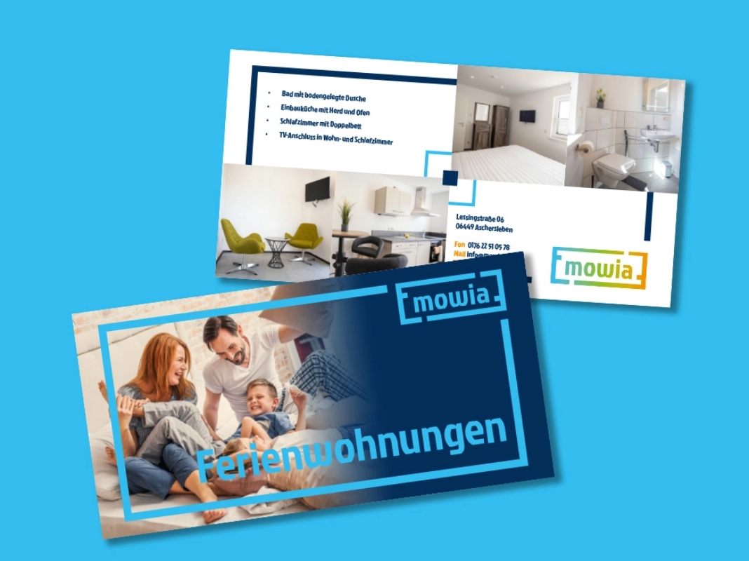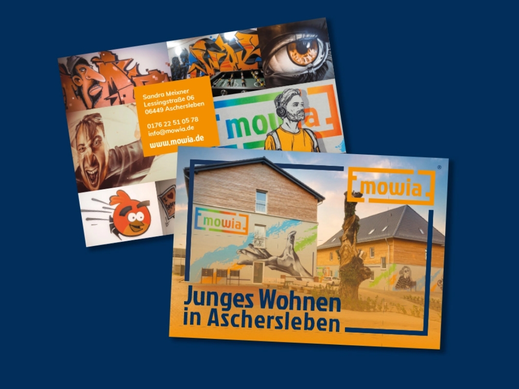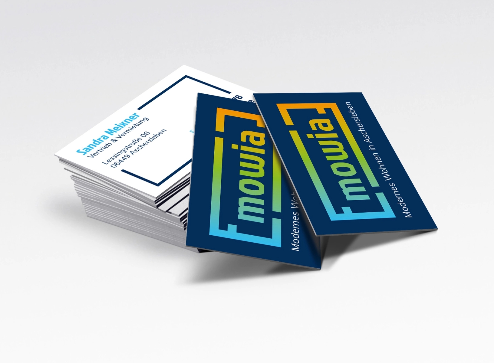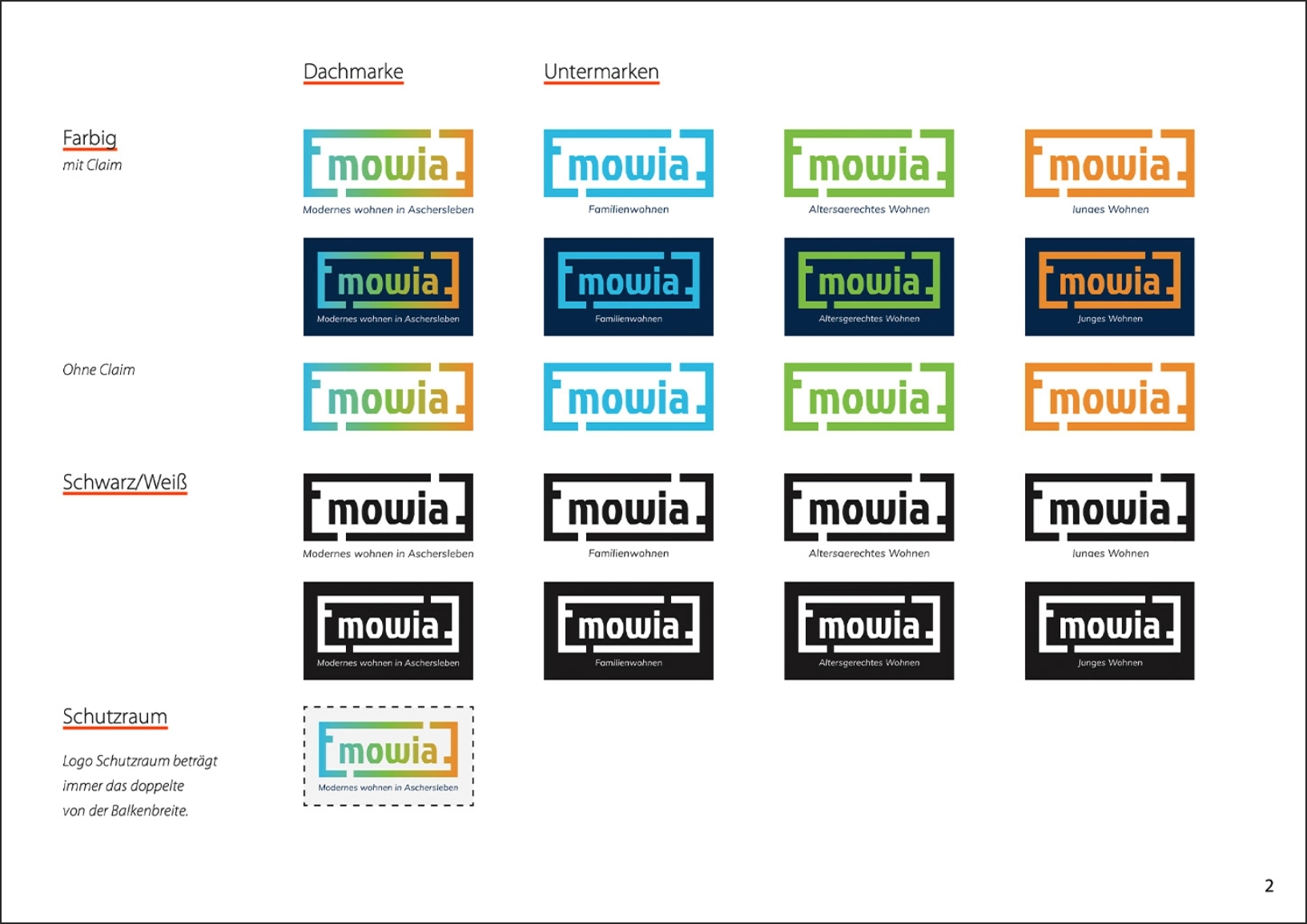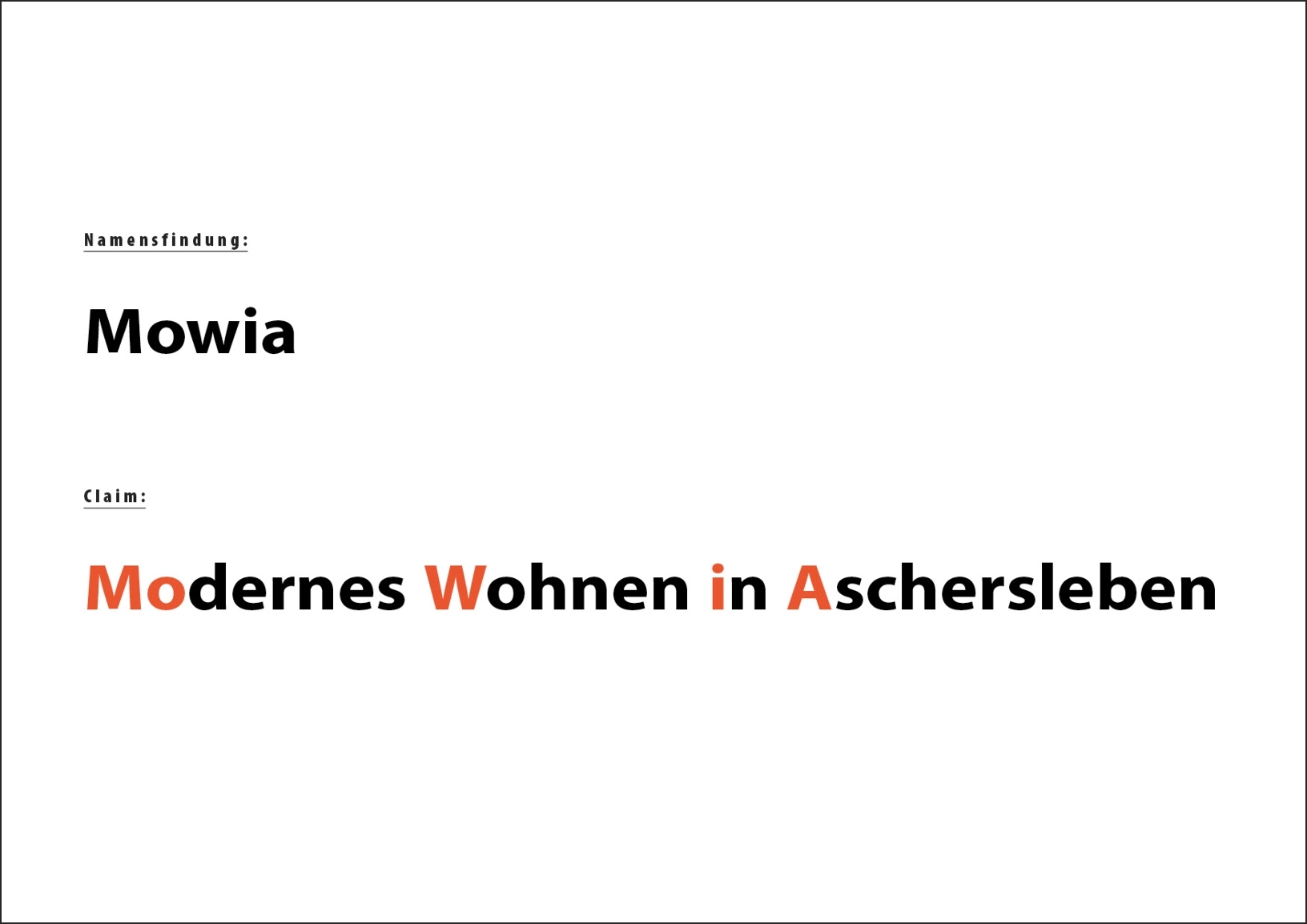 Zur geeigneten Namensfindung des Unternehmens wurden anfangs zwei Routen ausgearbeitet, wobei „mowia“ die Gründer überzeugen konnte. „Modernes Wohnen in Aschersleben“ zeigt schon im Namen die Vision, die das Unternehmen verfolgt und die sich auch in der Farbgebung des Corporate Designs widerspiegelt. Der Name hebt sich zum Einen von der bestehenden Konkurrenz ab und zeigt sogleich, was potenzielle Interessenten erwartet: moderner Wohnraum, ein modernes Auftreten und Zuverlässigkeit.