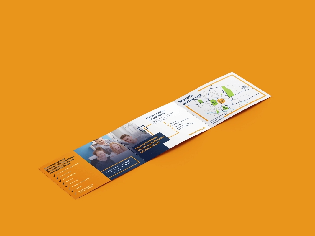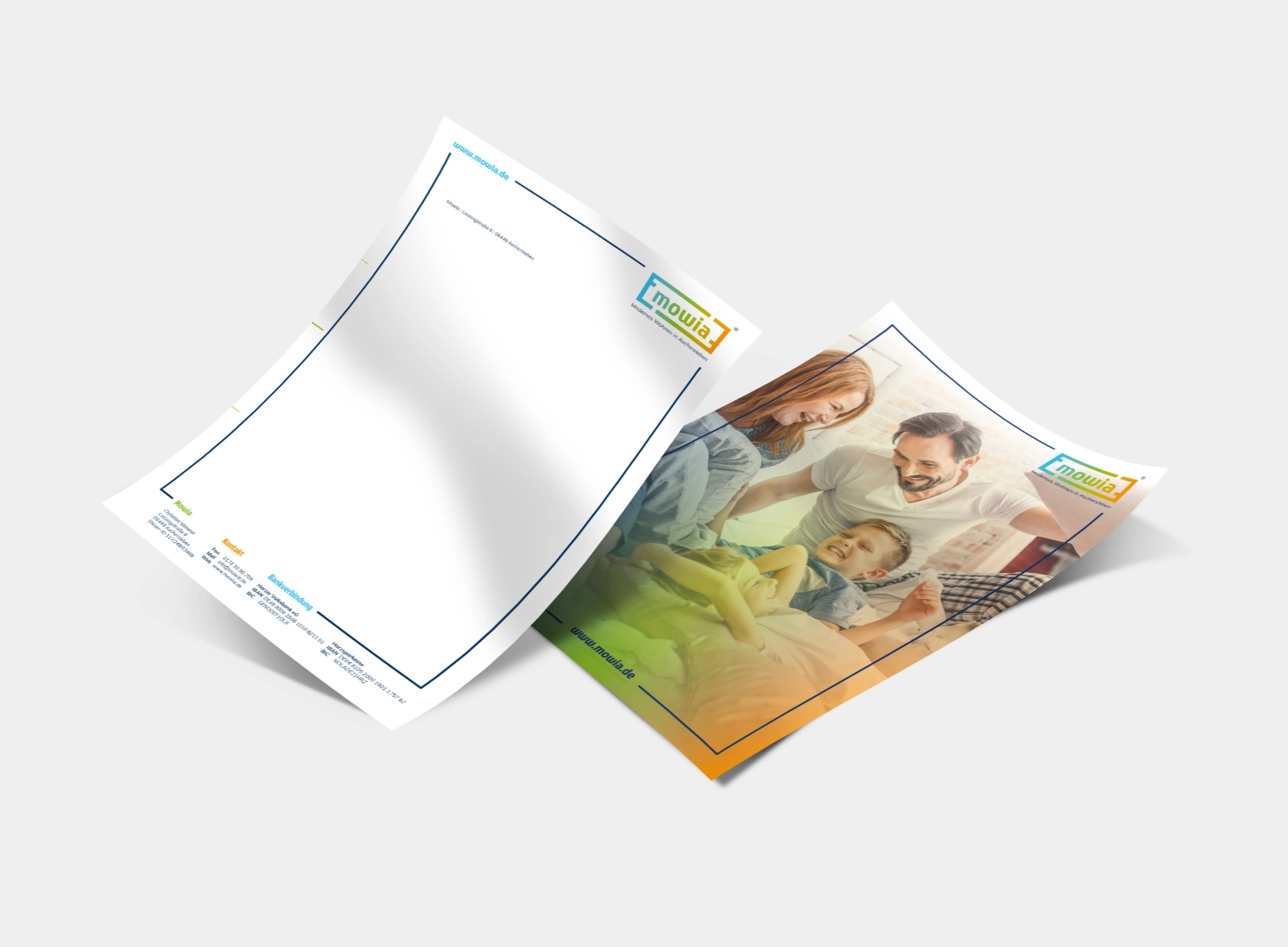Die Geschäftsausstattung der Marke findet sich in der Farbigkeit der Dachmarke wieder. So wird in den Briefbögen und Visitenkarten ein Akzent durch den Farbverlauf auf der Rückseite gesetzt, wohingegen die Werbemittel auf die einzelnen Untermarken angepasst sind. Durch Werbemittel wie die Banner wird ein Blickfang erzeugt und schon von Weitem ziehen die Banner die Aufmerksamkeit förmlich auf sich. Aber auch die Preislisten und Flyer kommen nicht langweilig daher und zeigen die Vision: modernen Wohnraum und auch die Kompetenz des Unternehmens. Ein wahres Statement setzen auch die Jutebeutel mit der Wort-Bild-Marke der Dachmarke im klassischen Farbverlauf von MOWIA.