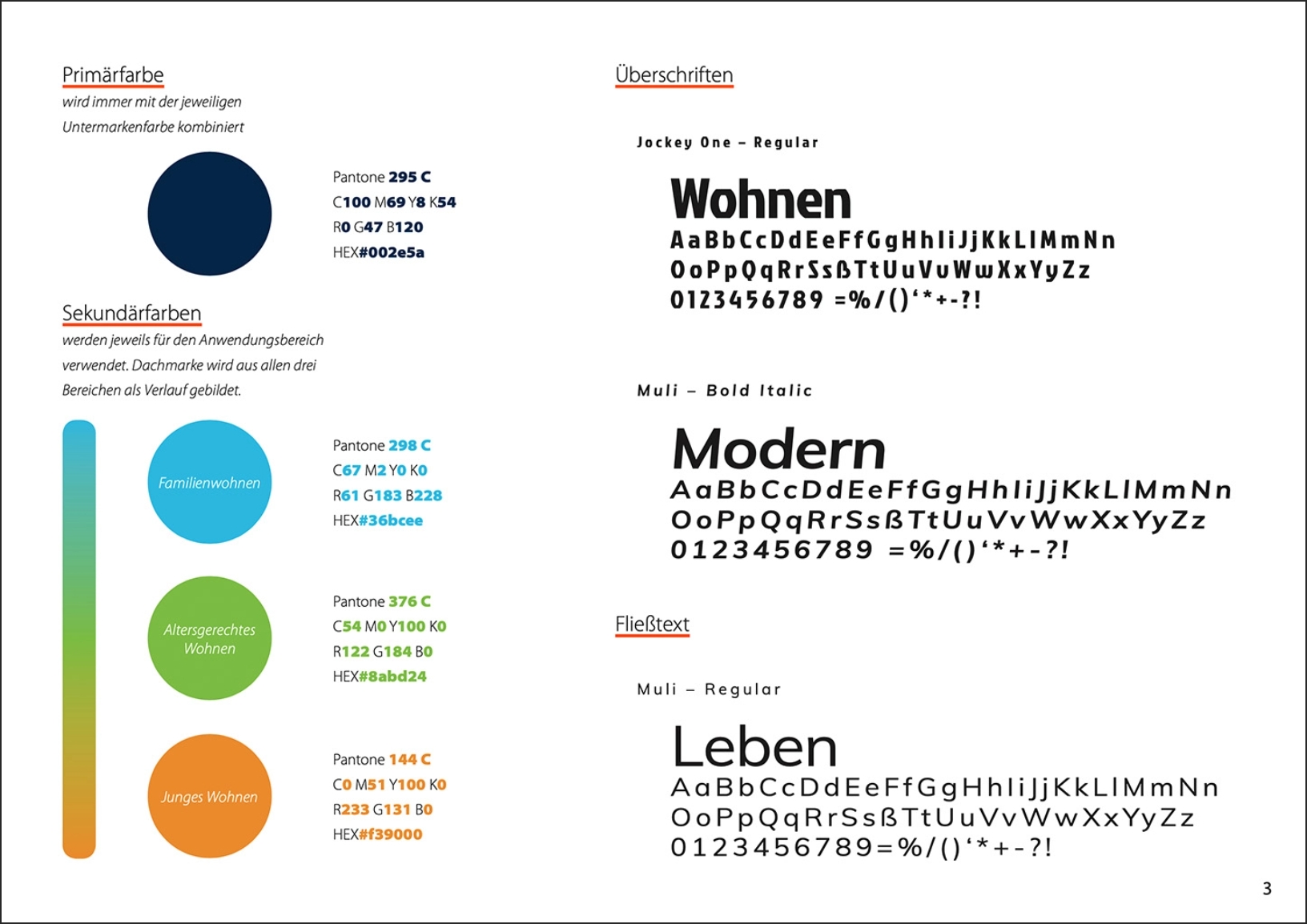 Für die Untermarken wurden drei intensive und lebendige Farben gewählt, die im Kontrast zur Primärfarbe stehen. Die gewählte Farbigkeit drückt den lebendigen Charakter der Wohnanlagen aus und hebt sich von den Wettbewerbern ab.