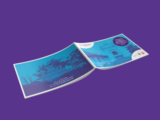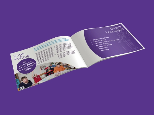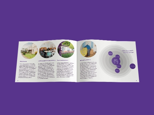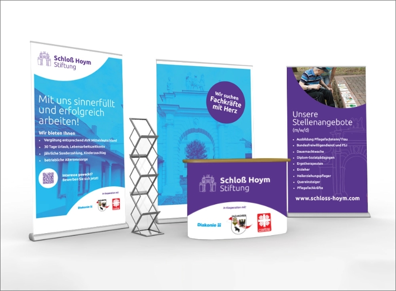Die Printprodukte der Schloss Hoym Stiftung wurden so gestaltet, dass sie sowohl informativ als auch optisch ansprechend sind. Durch die Verwendung des einheitlichen Corporate Designs wird eine klare visuelle Identität geschaffen, die sich durch alle Printmaterialien zieht. Der markante Einsatz der Farben Violett und Weiß unterstreicht die Verbindung zur Diakonie und sorgt gleichzeitig für eine moderne, saubere Optik. Die Bildsprache ist freundlich und einladend, mit großflächigen Fotos des Schlosses, die Vertrauen und Wärme ausstrahlen. Als optisches Highlight sind manche Titelbilder mit einem Dual-Tone-Effekt versehen, der den Bildern einen modernen und frischen Look verleiht und das Design zusätzlich aufwertet. Textlich wird der Leser direkt angesprochen, wobei wichtige Informationen übersichtlich präsentiert und mit visuellen Akzenten hervorgehoben werden.