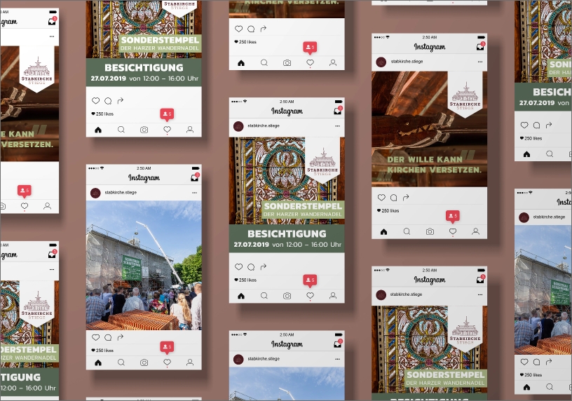 Die Farbgebung ist harmonisch auf das Bauwerk und seine Umgebung abgestimmt: Ein kräftiges Rotbraun, inspiriert vom warmen Innenraum der Kirche, trifft auf sanfte Grüntöne, die die Natur des Harzes widerspiegeln. Durch den Hell-Dunkel-Kontrast entsteht eine ausgewogene Komposition, die sowohl Stärke als auch Natürlichkeit verkörpert. Dieses Corporate Design fängt die Seele der Stabkirche ein und macht sie in moderner Form für die Öffentlichkeit zugänglich.