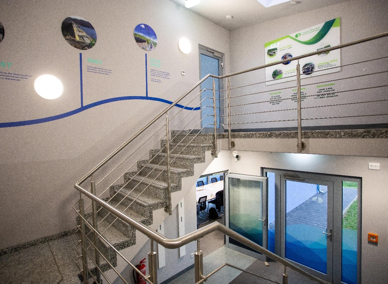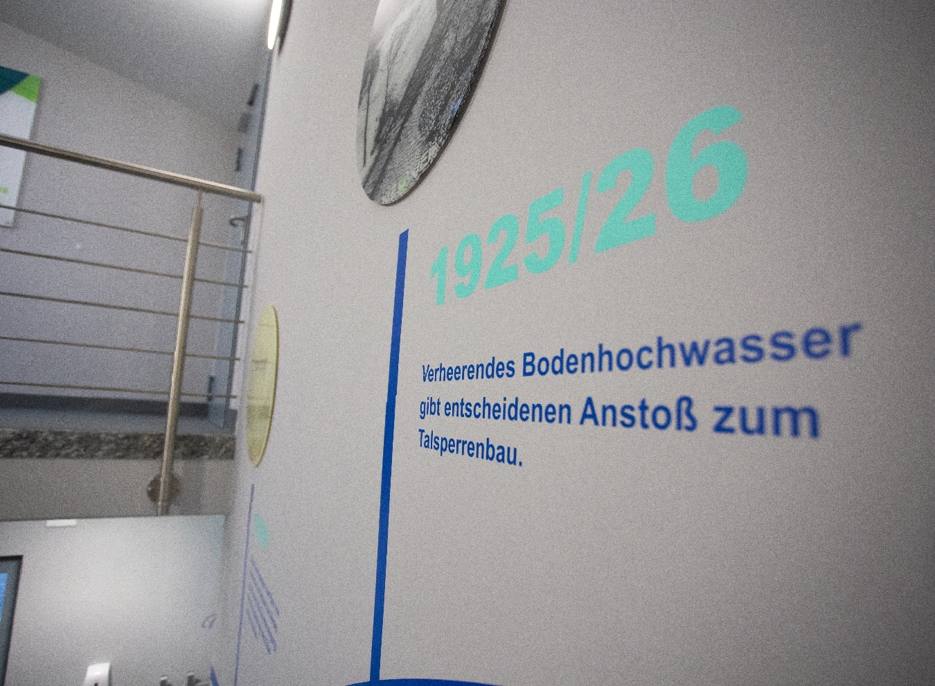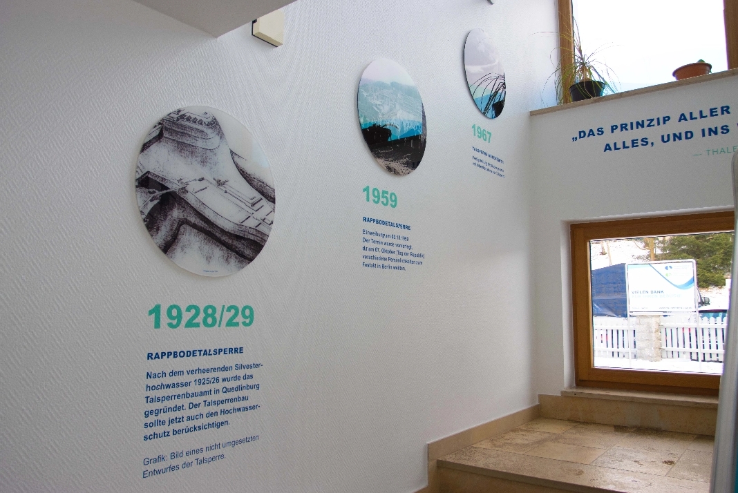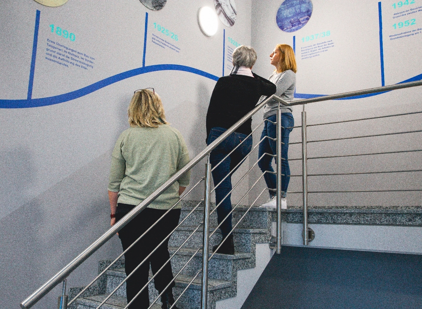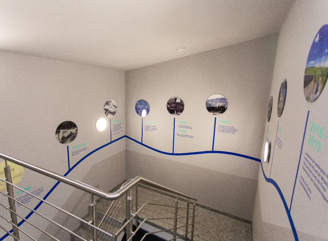 Eine visuelle Zeitreise von uns aufbereitet, gestaltet und angebracht führt die Besucher durch die bedeutenden Ereignisse und Entwicklungen rund um den Muldestausee und macht das Treppenhaus zu einem informativen und interessanten Erlebnisbereich.