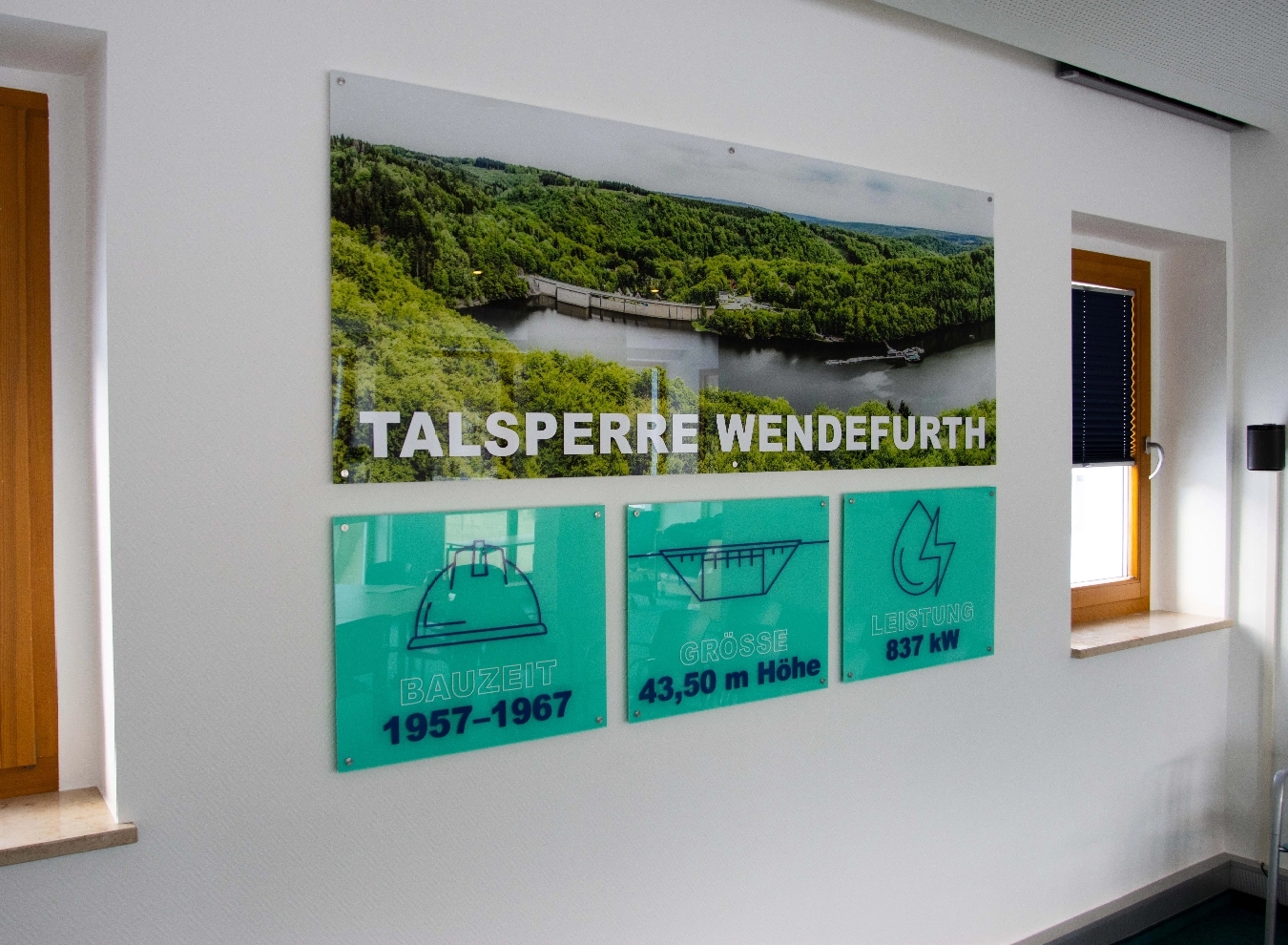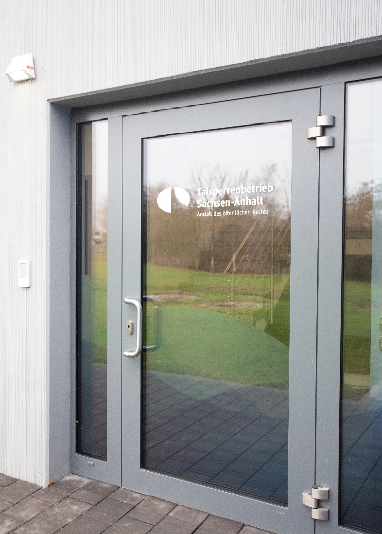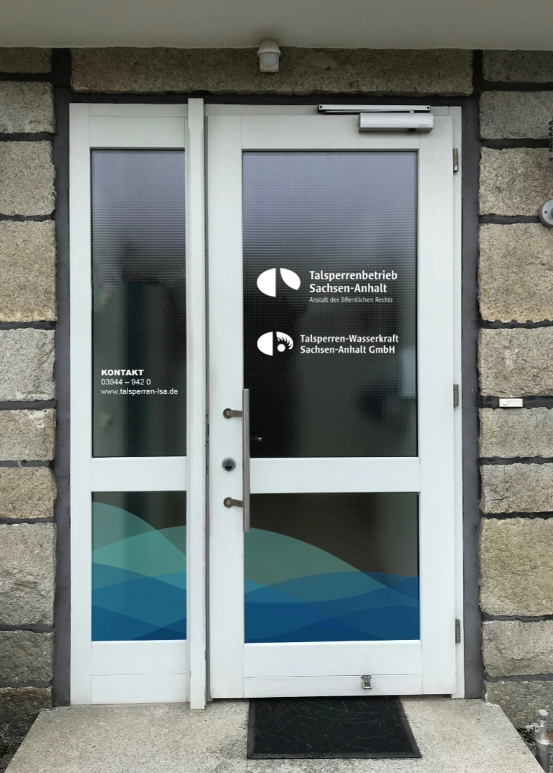 Das Logo an der Fassade, das Besucher sogleich zum Talsperrenbetrieb Sachsen-Anhalt AöR führt, ist erst der Anfang unseres Konzeptes für die Innengestaltung des Dienstgebäudes am Muldestausee. Im Inneren haben wir atemberaubende Wandaufkleber und Panoramabilder installiert, die die Schönheit des Muldestausees und seiner Umgebung einfangen.