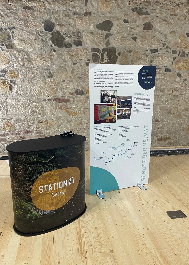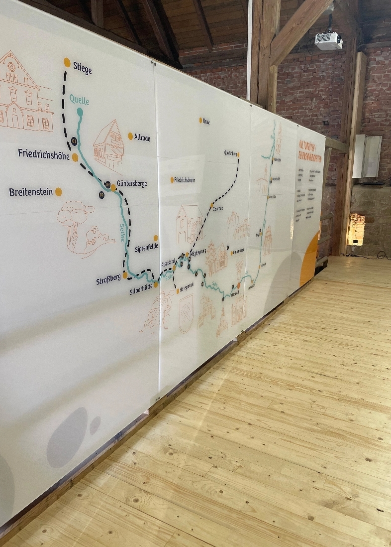 Die modulare Ausstellung in der renovierten Scheune in Meisdorf haben wir in fünf Stationen unterteilt, um die Herausforderungen und Lösungen des Hochwasserschutzes im Selketal umfassend zu präsentieren. Mit dem Konzept und der Gestaltung war es unser Ziel, die Besucher – Schulklassen, Anwohner und Touristen gleichermaßen – nicht nur zu informieren, sondern auch zu begeistern. Daher haben wir neben informativen Texten auch auf visuelle Elemente wie Infografiken, interaktive Experimente und digitale Medien gesetzt.