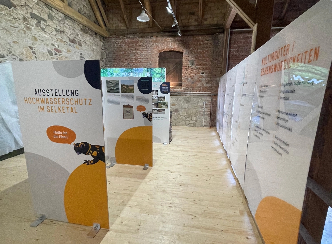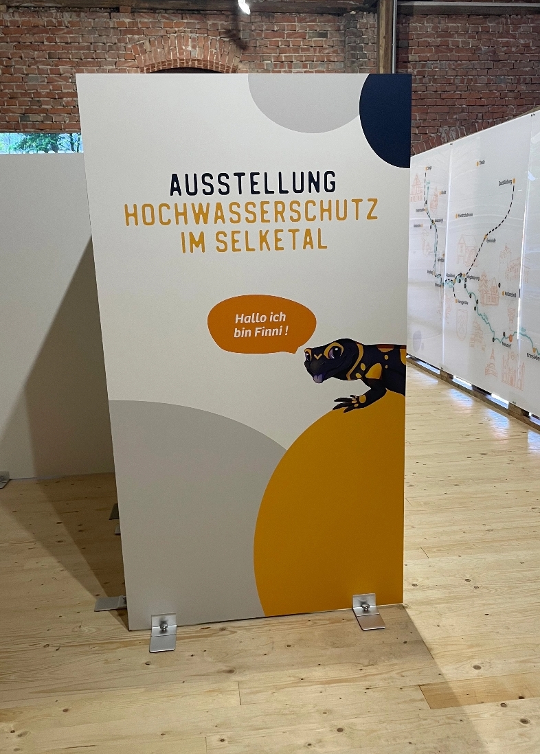 Ein feines Detail und besonderes Highlight stellt das Maskottchen „Finni“ dar. Wir haben den Feuersalamander entwickelt, welcher vom Hochwasserereignis 1994 im Selketal und den heutigen Maßnahmen zur Prävention berichtet.